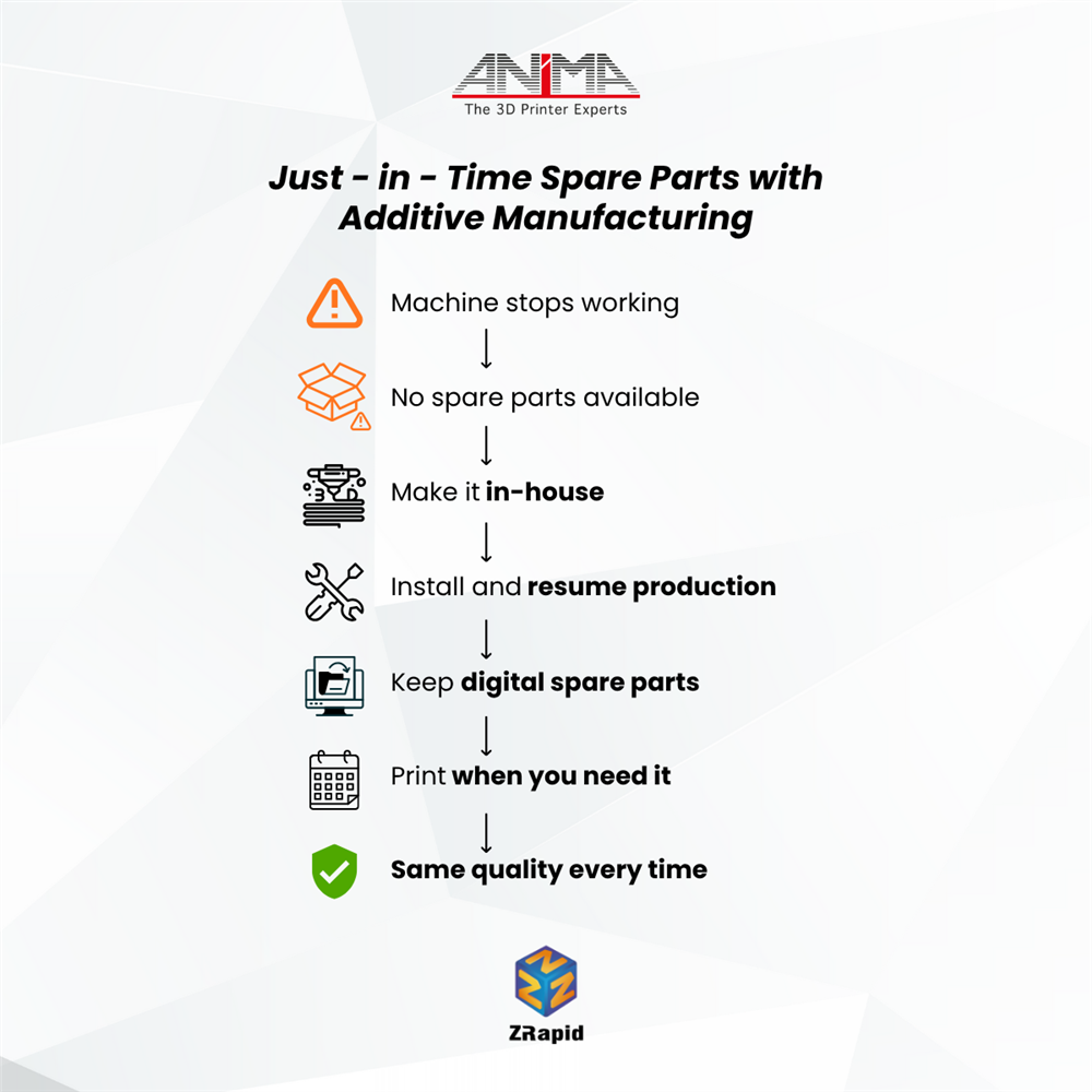Consider a production facility that relies on specialized machine components with lead times of 8–12 weeks when ordered from an external supplier. By building a library of validated 3D-printable spare parts, that facility can shift to just-in-time production.